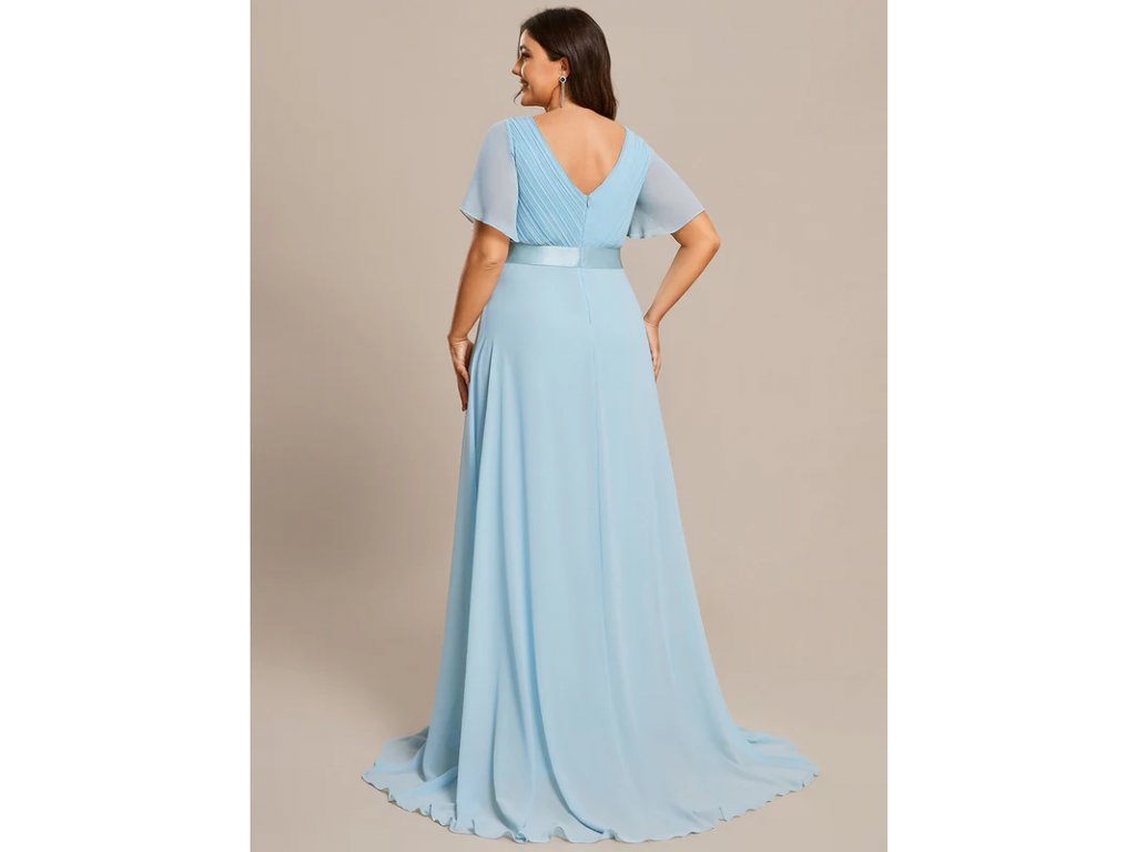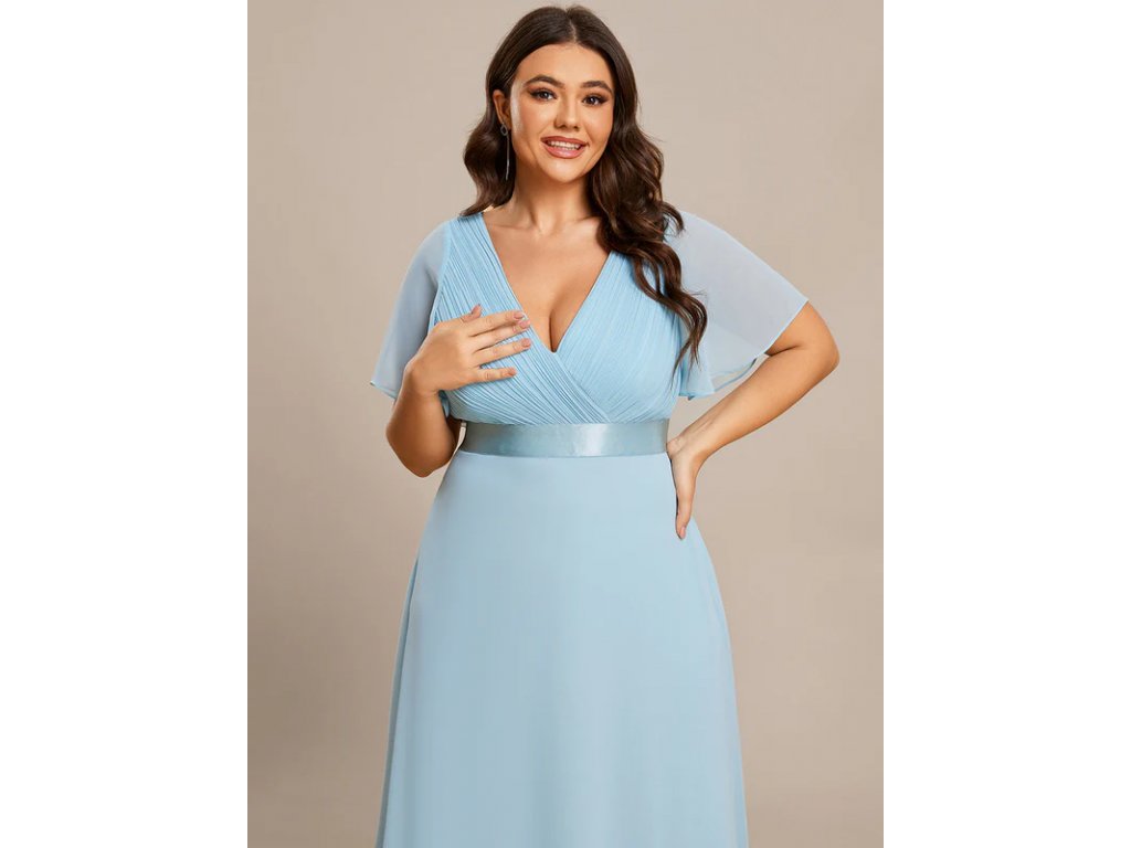 Okouzlující světle modré šaty s výstřihem do V i na zádech. Ramena a ruce Vám zakryjí jednoduché šifonové rukávky. Skládaný živůtek upozorní velmi decentně na Vaše přednosti. Zvýraznění pasu vytvoří opticky štíhlou postavu. A zakryje vypouklejší bříško. Šaty jsou vypodšívkované tak, abyste nemusela mít podprsenku.