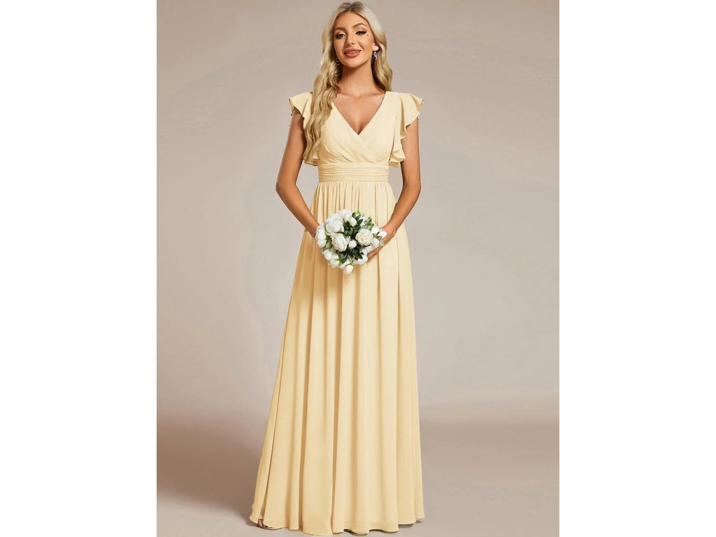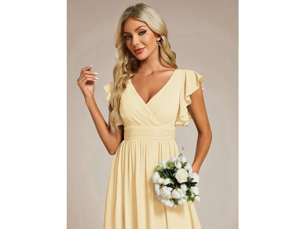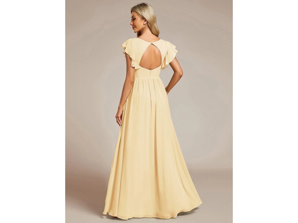 Žluté elegantní šaty pro družičku s výstřihem do V, otevřenými zády a volánkovými rukávy ze šifonu